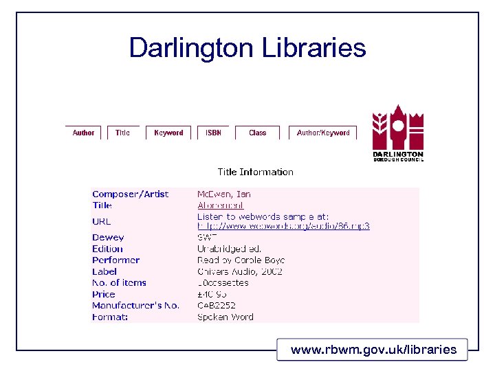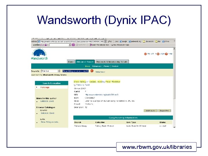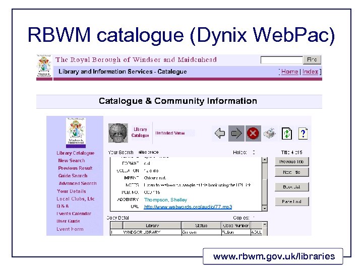 RBWM catalogue (Dynix Web. Pac) Thompson, Shelley http: //www. webwords. org/audio/77. mp 3 www. rbwm. gov. uk/libraries