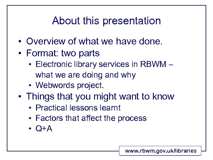About this presentation • Overview of what we have done. • Format: two parts • Electronic library services in RBWM – what we are doing and why • Webwords project. • Things that you might want to know • Practical lessons learnt • Factors that affect the process • Q+A www. rbwm. gov. uk/libraries