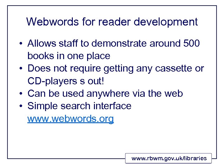 Webwords for reader development • Allows staff to demonstrate around 500 books in one place • Does not require getting any cassette or CD-players s out! • Can be used anywhere via the web • Simple search interface www. webwords. org www. rbwm. gov. uk/libraries