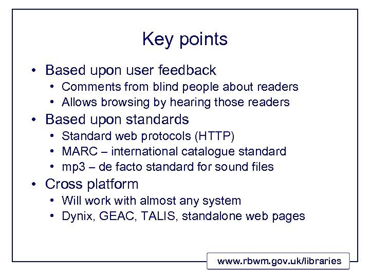 Key points • Based upon user feedback • Comments from blind people about readers • Allows browsing by hearing those readers • Based upon standards • Standard web protocols (HTTP) • MARC – international catalogue standard • mp 3 – de facto standard for sound files • Cross platform • Will work with almost any system • Dynix, GEAC, TALIS, standalone web pages www. rbwm. gov. uk/libraries