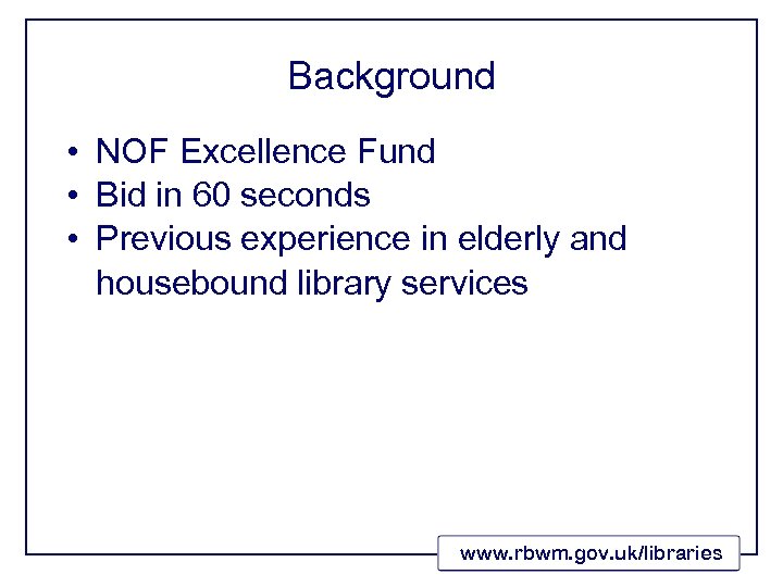 Background • NOF Excellence Fund • Bid in 60 seconds • Previous experience in elderly and housebound library services www. rbwm. gov. uk/libraries