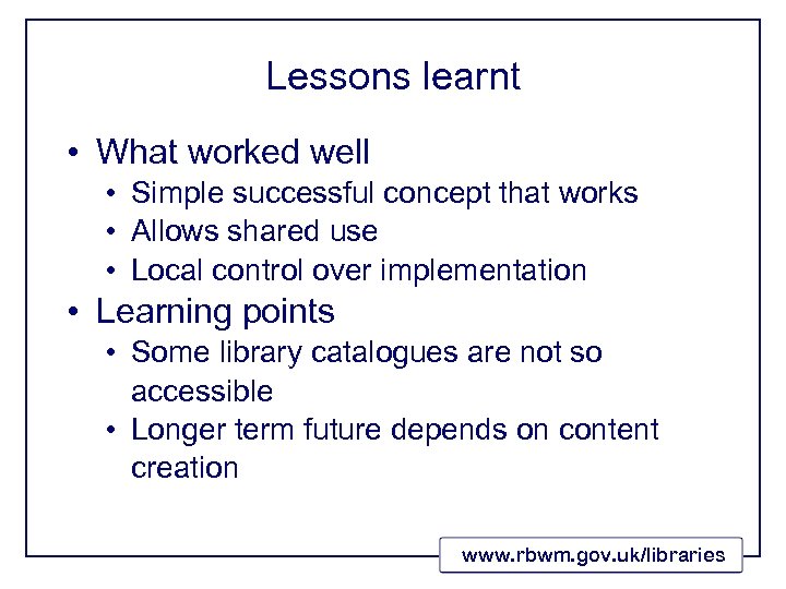 Lessons learnt • What worked well • Simple successful concept that works • Allows shared use • Local control over implementation • Learning points • Some library catalogues are not so accessible • Longer term future depends on content creation www. rbwm. gov. uk/libraries