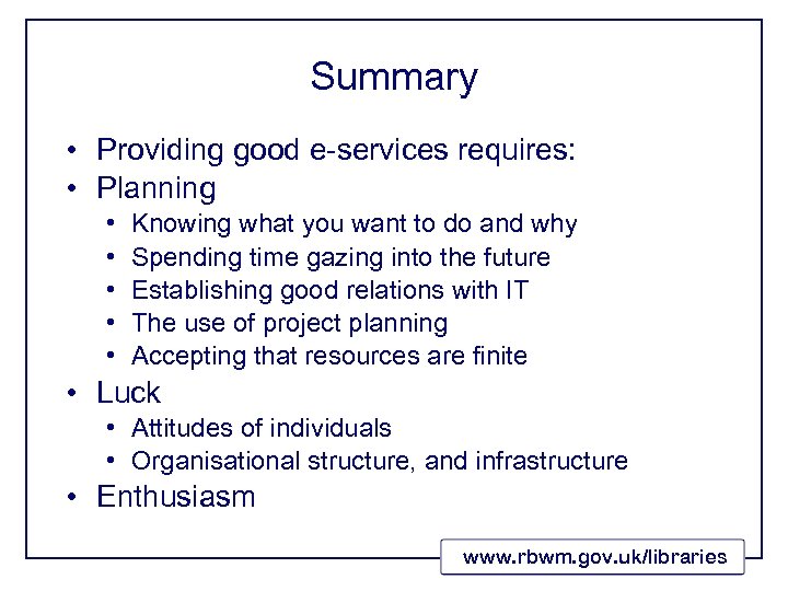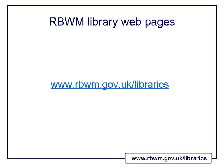 Summary • Providing good e-services requires: • Planning • • • Knowing what you want to do and why Spending time gazing into the future Establishing good relations with IT The use of project planning Accepting that resources are finite • Luck • Attitudes of individuals • Organisational structure, and infrastructure • Enthusiasm www. rbwm. gov. uk/libraries