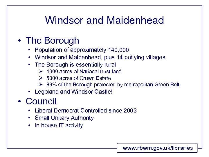 Windsor and Maidenhead • The Borough • Population of approximately 140, 000 • Windsor and Maidenhead, plus 14 outlying villages • The Borough is essentially rural Ø 1000 acres of National trust land Ø 5000 acres of Crown Estate Ø 83% of the Borough protected by metropolitan Green Belt. • Legoland Windsor Castle! • Council • Liberal Democrat Controlled since 2003 • Small Unitary Authority • In house IT activity www. rbwm. gov. uk/libraries
