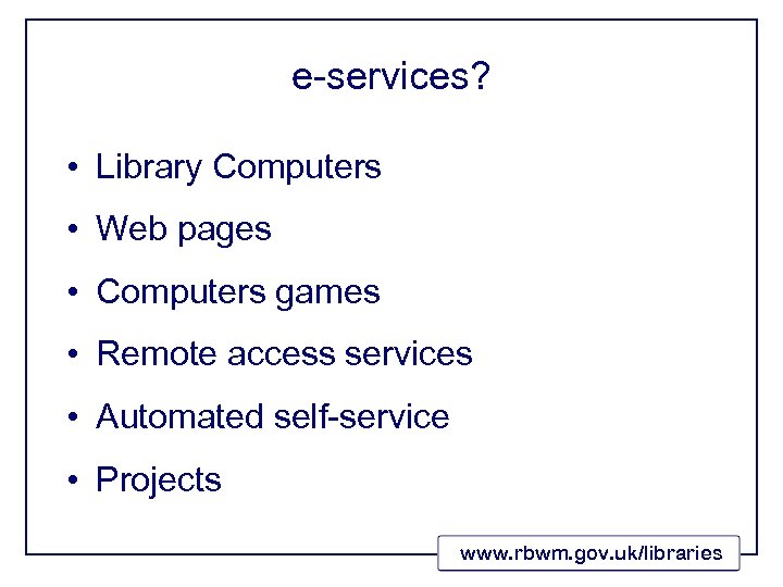 e-services? • Library Computers • Web pages • Computers games • Remote access services • Automated self-service • Projects www. rbwm. gov. uk/libraries