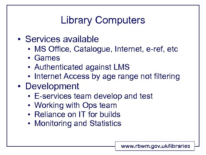Library Computers • Services available • • MS Office, Catalogue, Internet, e-ref, etc Games Authenticated against LMS Internet Access by age range not filtering • • E-services team develop and test Working with Ops team Reliance on IT for builds Monitoring and Statistics • Development www. rbwm. gov. uk/libraries