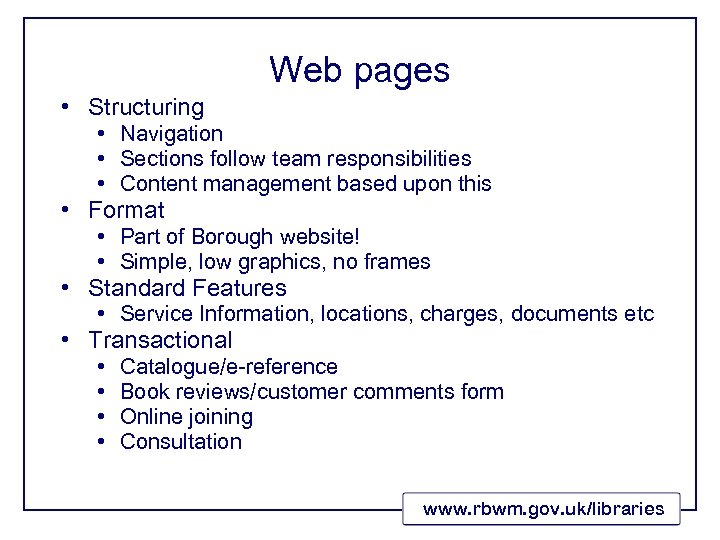 • Structuring Web pages • Navigation • Sections follow team responsibilities • Content management based upon this • Format • Part of Borough website! • Simple, low graphics, no frames • Standard Features • Service Information, locations, charges, documents etc • Transactional • • Catalogue/e-reference Book reviews/customer comments form Online joining Consultation www. rbwm. gov. uk/libraries