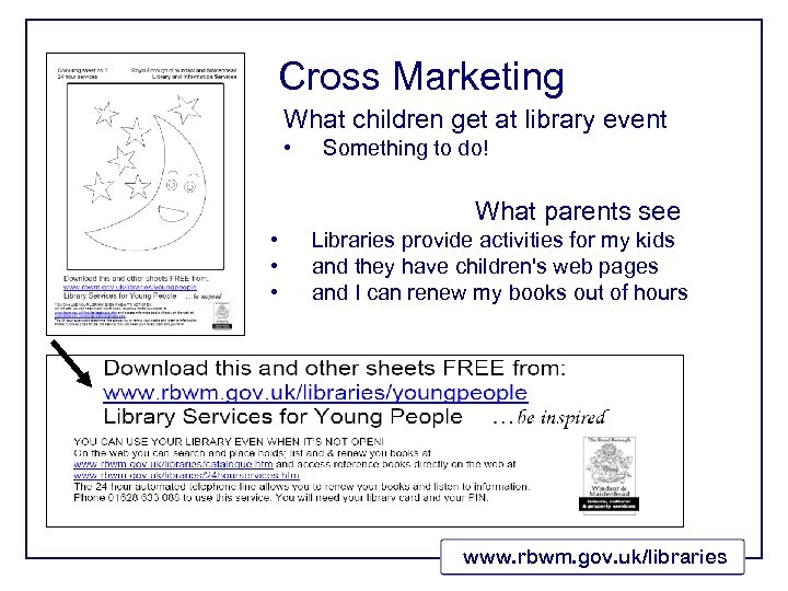 Cross Marketing What children get at library event • Something to do! What parents see • • • Libraries provide activities for my kids and they have children's web pages and I can renew my books out of hours www. rbwm. gov. uk/libraries