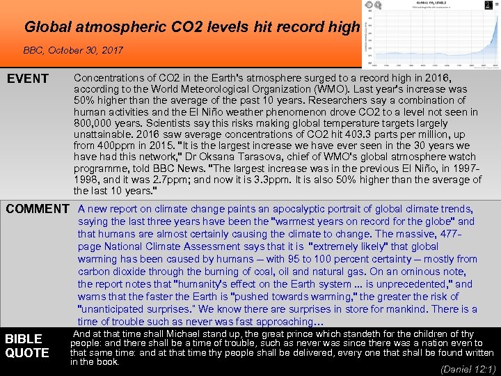 Global atmospheric CO 2 levels hit record high BBC, October 30, 2017 EVENT Concentrations of CO 2 in the Earth's atmosphere surged to a record high in 2016, according to the World Meteorological Organization (WMO). Last year's increase was 50% higher than the average of the past 10 years. Researchers say a combination of human activities and the El Niño weather phenomenon drove CO 2 to a level not seen in 800, 000 years. Scientists say this risks making global temperature targets largely unattainable. 2016 saw average concentrations of CO 2 hit 403. 3 parts per million, up from 400 ppm in 2015. "It is the largest increase we have ever seen in the 30 years we have had this network, " Dr Oksana Tarasova, chief of WMO's global atmosphere watch programme, told BBC News. "The largest increase was in the previous El Niño, in 19971998, and it was 2. 7 ppm; and now it is 3. 3 ppm. It is also 50% higher than the average of the last 10 years. " COMMENT A new report on climate change paints an apocalyptic portrait of global climate trends, saying the last three years have been the "warmest years on record for the globe" and that humans are almost certainly causing the climate to change. The massive, 477 page National Climate Assessment says that it is "extremely likely" that global warming has been caused by humans -- with 95 to 100 percent certainty -- mostly from carbon dioxide through the burning of coal, oil and natural gas. On an ominous note, the report notes that "humanity's effect on the Earth system. . . is unprecedented, " and warns that the faster the Earth is "pushed towards warming, " the greater the risk of "unanticipated surprises. ” We know there are surprises in store for mankind. There is a time of trouble such as never was fast approaching… BIBLE QUOTE And at that time shall Michael stand up, the great prince which standeth for the children of thy people: and there shall be a time of trouble, such as never was since there was a nation even to that same time: and at that time thy people shall be delivered, every one that shall be found written in the book. (Daniel 12: 1)