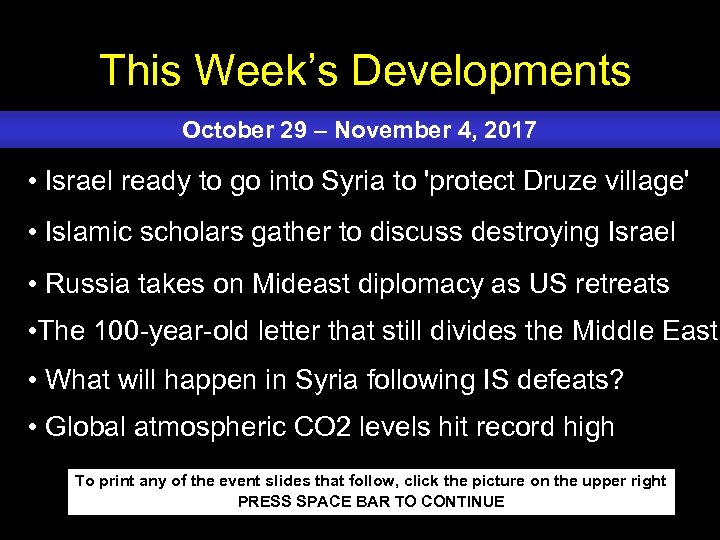 This Week’s Developments October 29 – November 4, 2017 • Israel ready to go into Syria to 'protect Druze village' • Islamic scholars gather to discuss destroying Israel • Russia takes on Mideast diplomacy as US retreats • The 100 -year-old letter that still divides the Middle East • What will happen in Syria following IS defeats? • Global atmospheric CO 2 levels hit record high To print any of the event slides that follow, click the picture on the upper right PRESS SPACE BAR TO CONTINUE