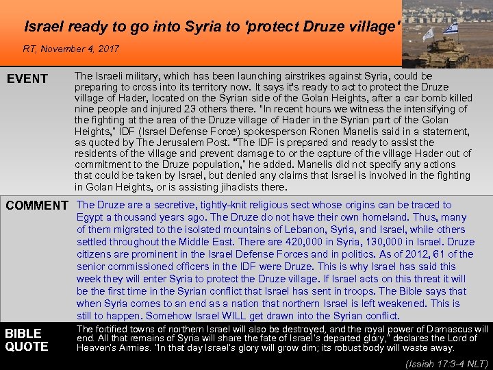 Israel ready to go into Syria to 'protect Druze village' RT, November 4, 2017 EVENT The Israeli military, which has been launching airstrikes against Syria, could be preparing to cross into its territory now. It says it's ready to act to protect the Druze village of Hader, located on the Syrian side of the Golan Heights, after a car bomb killed nine people and injured 23 others there. “In recent hours we witness the intensifying of the fighting at the area of the Druze village of Hader in the Syrian part of the Golan Heights, ” IDF (Israel Defense Force) spokesperson Ronen Manelis said in a statement, as quoted by The Jerusalem Post. "The IDF is prepared and ready to assist the residents of the village and prevent damage to or the capture of the village Hader out of commitment to the Druze population, ” he added. Manelis did not specify any actions that could be taken by Israel, but denied any claims that Israel is involved in the fighting in Golan Heights, or is assisting jihadists there. COMMENT The Druze are a secretive, tightly-knit religious sect whose origins can be traced to Egypt a thousand years ago. The Druze do not have their own homeland. Thus, many of them migrated to the isolated mountains of Lebanon, Syria, and Israel, while others settled throughout the Middle East. There are 420, 000 in Syria, 130, 000 in Israel. Druze citizens are prominent in the Israel Defense Forces and in politics. As of 2012, 61 of the senior commissioned officers in the IDF were Druze. This is why Israel has said this week they will enter Syria to protect the Druze village. If Israel acts on this threat it will be the first time in the Syrian conflict that Israel has sent in troops. The Bible says that when Syria comes to an end as a nation that northern Israel is left weakened. This is still to happen. Somehow Israel WILL get drawn into the Syrian conflict. BIBLE QUOTE The fortified towns of northern Israel will also be destroyed, and the royal power of Damascus will end. All that remains of Syria will share the fate of Israel’s departed glory, ” declares the Lord of Heaven’s Armies. “In that day Israel’s glory will grow dim; its robust body will waste away. (Isaiah 17: 3 -4 NLT)