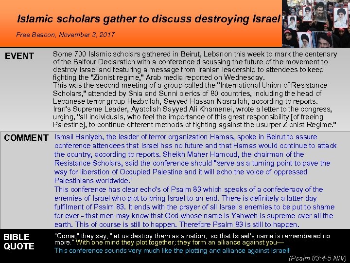 Islamic scholars gather to discuss destroying Israel Free Beacon, November 3, 2017 EVENT Some 700 Islamic scholars gathered in Beirut, Lebanon this week to mark the centenary of the Balfour Declaration with a conference discussing the future of the movement to destroy Israel and featuring a message from Iranian leadership to attendees to keep fighting the "Zionist regime, " Arab media reported on Wednesday. This was the second meeting of a group called the "International Union of Resistance Scholars, " attended by Shia and Sunni clerics of 80 countries, including the head of Lebanese terror group Hezbollah, Seyyed Hassan Nasrallah, according to reports. Iran's Supreme Leader, Ayatollah Sayyed Ali Khamenei, wrote a letter to the congress, urging, "all individuals, who feel the importance of this great responsibility [of freeing Palestine], to continue different methods of fighting against the usurper Zionist Regime. " COMMENT Ismail Haniyeh, the leader of terror organization Hamas, spoke in Beirut to assure conference attendees that Israel has no future and that Hamas would continue to attack the country, according to reports. Sheikh Maher Hamoud, the chairman of the Resistance Scholars, said the conference should "serve as a turning point to pave the way for liberation of Occupied Palestine and it will echo the voice of oppressed Palestinians worldwide. ” This conference has clear echo's of Psalm 83 which speaks of a confederacy of the enemies of Israel who plot to bring Israel to an end. There is definitely a latter day fulfilment of Psalm 83. It ends with the prayer of all Israel’s enemies to be put to shame for ever - that men may know that God whose name is Yahweh is supreme over all the earth. This of course is still to happen. Therefore Psalm 83 is still to happen. BIBLE QUOTE “Come, ” they say, “let us destroy them as a nation, so that Israel’s name is remembered no more. ” With one mind they plot together; they form an alliance against you— This conference sounds very much like the plotting and alliance against Israel! (Psalm 83: 4 -5 NIV)