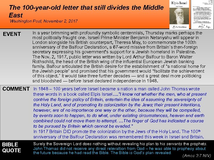 The 100 -year-old letter that still divides the Middle East Washington Post, November 2, 2017 EVENT In a year brimming with profoundly symbolic centennials, Thursday marks perhaps the most politically fraught one. Israeli Prime Minister Benjamin Netanyahu will appear in London alongside his British counterpart, Theresa May, to commemorate the 100 th anniversary of the Balfour Declaration, a 67 -word missive from Britain’s then-foreign secretary expressing his government's support for a Jewish homeland in Palestine. The Nov. 2, 1917, public letter was written by Lord Arthur Balfour to Baron Walter Rothschild, the head of the British wing of the influential European Jewish banking family. Balfour articulated the British desire for the establishment of “a national home for the Jewish people” and promised that his government would “facilitate the achievement of this object. ” It would take three further decades — and a great deal more politicking and bloodshed — before Israel declared independence in 1948. COMMENT In 1848 – 100 years before Israel became a nation a man called John Thomas wrote these words in a book called Elpis Israel…. ”I know not whether the men, who at present contrive the foreign policy of Britain, entertain the idea of assuming the sovereignty of the Holy Land, and of promoting its colonization by the Jews; their present intentions, however, are of no importance one way or the other, because they will be compelled, by events soon to happen, to do what, under existing circumstances, heaven and earth combined could not move them to attempt. …The finger of God has indicated a course to be pursued by Britain which cannot be evaded. ” In 1917 Britain DID promote the colonization by the Jews of the Holy Land. The 100 th anniversary of the Balfour Declaration was remembered this week in Israel and Britain. BIBLE QUOTE Surely the Sovereign Lord does nothing without revealing his plan to his servants the prophets. John Thomas did not receive any direct relevaltion from God – he was able to prophesy about the future because he had read the Bible. The Bible is God’s plan revealed. (Amos 3: 7 NIV)