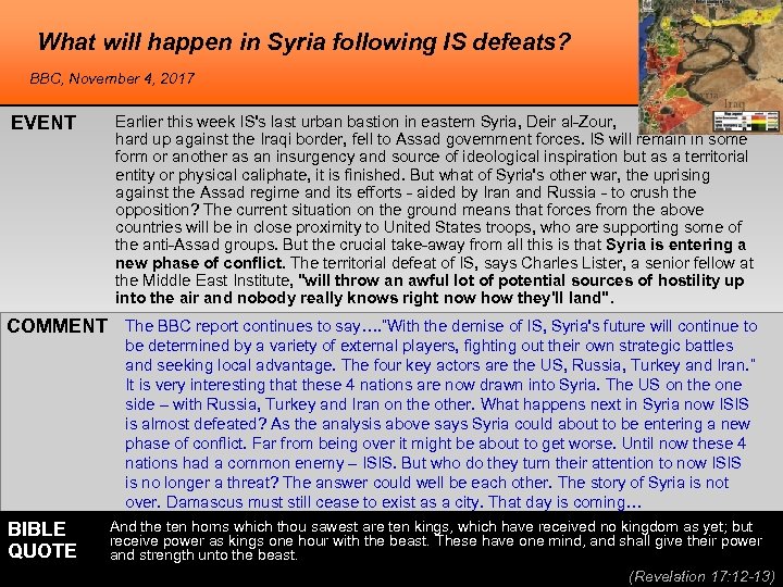 What will happen in Syria following IS defeats? BBC, November 4, 2017 EVENT Earlier this week IS's last urban bastion in eastern Syria, Deir al-Zour, hard up against the Iraqi border, fell to Assad government forces. IS will remain in some form or another as an insurgency and source of ideological inspiration but as a territorial entity or physical caliphate, it is finished. But what of Syria's other war, the uprising against the Assad regime and its efforts - aided by Iran and Russia - to crush the opposition? The current situation on the ground means that forces from the above countries will be in close proximity to United States troops, who are supporting some of the anti-Assad groups. But the crucial take-away from all this is that Syria is entering a new phase of conflict. The territorial defeat of IS, says Charles Lister, a senior fellow at the Middle East Institute, "will throw an awful lot of potential sources of hostility up into the air and nobody really knows right now how they'll land". COMMENT The BBC report continues to say…. ”With the demise of IS, Syria's future will continue to be determined by a variety of external players, fighting out their own strategic battles and seeking local advantage. The four key actors are the US, Russia, Turkey and Iran. ” It is very interesting that these 4 nations are now drawn into Syria. The US on the one side – with Russia, Turkey and Iran on the other. What happens next in Syria now ISIS is almost defeated? As the analysis above says Syria could about to be entering a new phase of conflict. Far from being over it might be about to get worse. Until now these 4 nations had a common enemy – ISIS. But who do they turn their attention to now ISIS is no longer a threat? The answer could well be each other. The story of Syria is not over. Damascus must still cease to exist as a city. That day is coming… BIBLE QUOTE And the ten horns which thou sawest are ten kings, which have received no kingdom as yet; but receive power as kings one hour with the beast. These have one mind, and shall give their power and strength unto the beast. (Revelation 17: 12 -13)