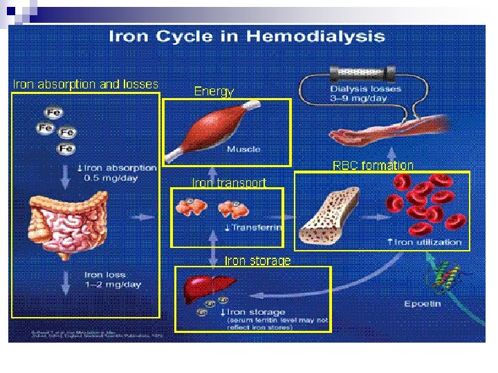 Summary n n n Iron (blood) losses are high in HD patients Regular use of intravenous (IV) iron improves sensitivity to Erythropoietin maintain TSAT >20% and ferritin >200 ng/m. L Adequate and appropriate dosing of Erythropoietin is necessary Aim for Hemoglobin (Hb) > 11 g/d. L, caution when intentionally maintaining Hb 13 g/d. L.