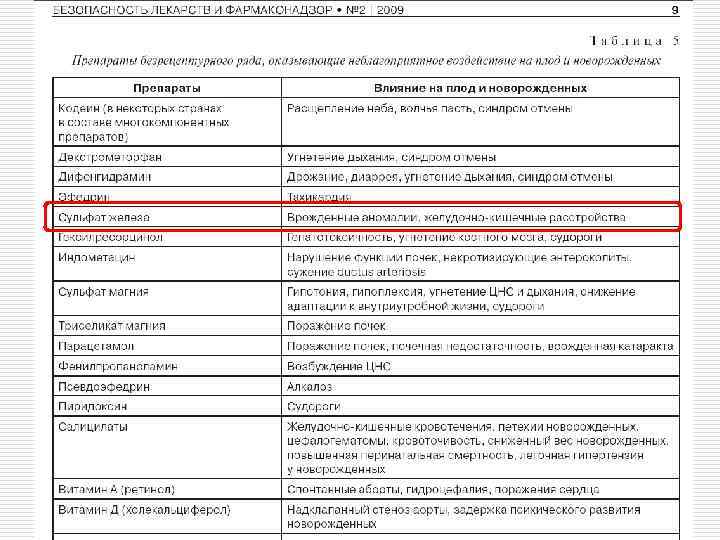 o Данные о тератогенном влиянии сульфата железа на развивающийся плод приведены в работе руководителя Федерального центра мониторинга безопасности лекарственных средств В. К. Лепахина. o Врождённые аномалии развития, пороки сердца, дисморфизм у плода могут являться прямым следствием употребления сульфата железа во время беременности. Астахова А. В. , Лепахин В. К. Лекарства. Неблагоприятные побочные реакции и контроль безопасности. Серия: Профессиональная медицина. М. , Эксмо, 2008