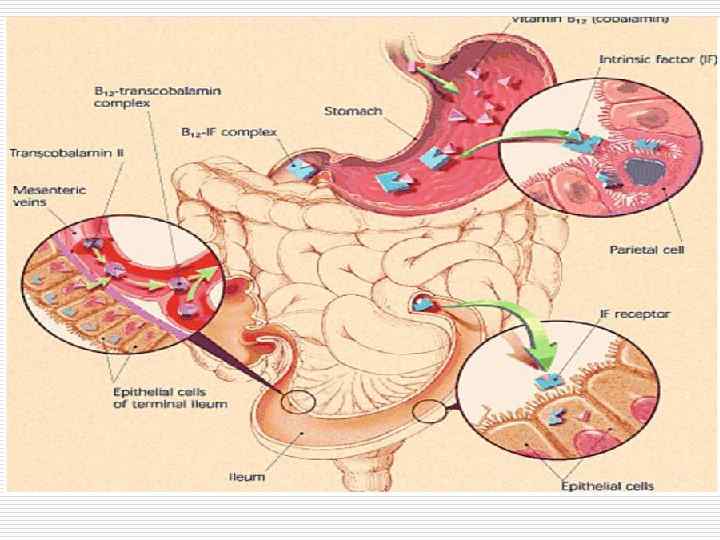 Основные причины развития МБА Дефицит витамина В 12 Неадекватное поступление Строгая вегетарианская диета (редко) Увеличенная потребность Беременность Лактация Нарушения абсорбции Врожд. дефицит внутр. ф. Кастла Гастрэктомия С. Золлингера-Эллисона Панкреатит Б. Крона Резекция кишечника Глисты и др.