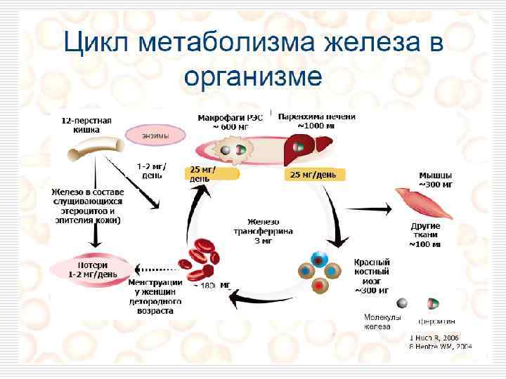 Резервное железо В нормальных условиях запасы железа составляют в среднем 1 г (1000 мг) и представляют собой соединения железа с белками, которые откладываются в основном в печени, селезенке и костном мозге: Ø Ферритин омплекс з -к и трехвалентного елеза ж и протеина апоферритина. Ø Гемосидерин – также комплекс железа и апоферритина, но с большим содержанием железа и меньшим белка, в результате чего соединение становится нерастворимым. Функциональное назначение резервного железа заключается в поддержании на постоянном уровне концентрации сывороточного железа.