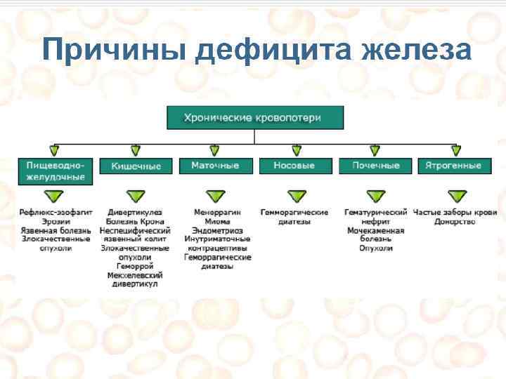 Анемии при хронических заболеваниях o Вторичные состояния, развивающиеся при длительно текущих инфекционных, воспалительных, системных и онкологических заболеваниях и сопровождающиеся сниженной продукцией эритроцитов и нарушенной реутилизацией железа.