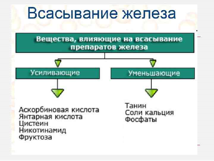 Причины неэффективности терапии препаратами железа для приема внутрь o отсутствие дефицита железа (неправильная трактовка природы гипохромной анемии и ошибочное назначение ПЖ); o недостаточная дозировка ПЖ (недоучет количества элементарного железа в препарате); o недостаточная длительность лечения ПЖ; o нарушение всасывания назначаемых внутрь ПЖ у больных с соответствующей патологией; o одновременный прием препаратов, нарушающих всасывание железа; o сочетание ЖДА с другими анемиями (В 12 дефицитной, фолиеводефицитной).