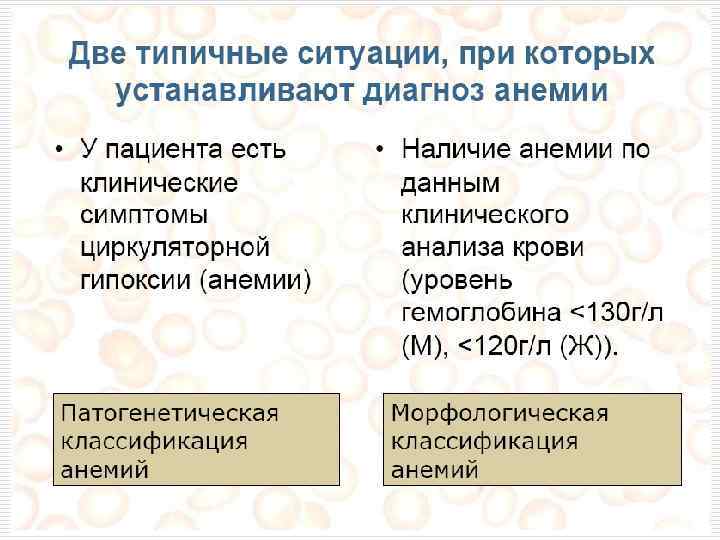 o АНЕМИЯ – клинико-лабораторный синдром, характеризующийся снижением уровня гемоглобина, эритроцитов и гематокрита в единице объема крови