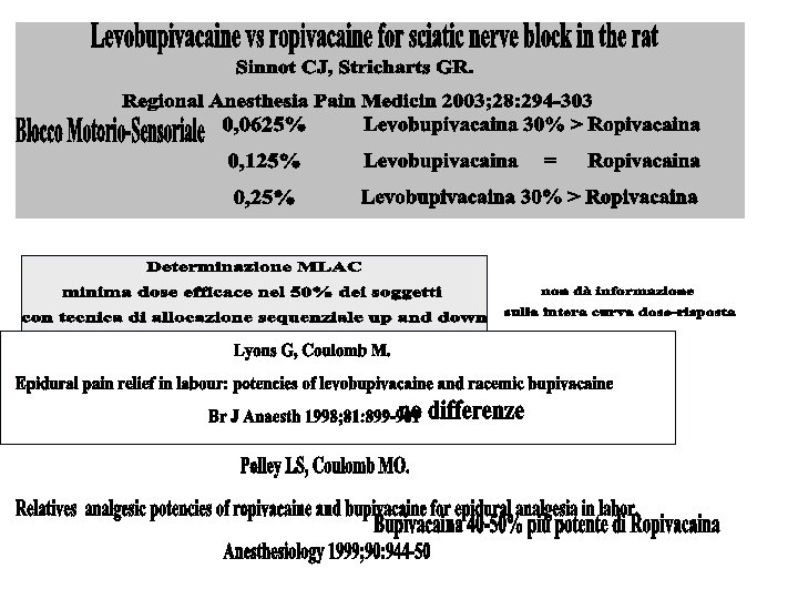 Gautier P. Comparison of the effects of intrathecal ropivacaine, levobupivacaine and bupivacaine for Caesarean section. Br J. Anaesth 2003; 91: 684 -89 Levo 0, 5% 8 mg vs Bupi 0, 5% 8 mg vs Ropi 0, 5% 12 mg Blocco motorio più lungo con Bupi