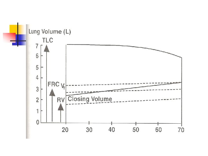 Pulmonary Function and Aging n Thorax stiffens – n n n reduced chest wall compliance & decreased thoracic skeletal muscle mass = Increased work of maximal breathing Lung volumes change – reduced inspiratory and expiratory reserve volume Decrease in elastic lung recoil –closing volume increase