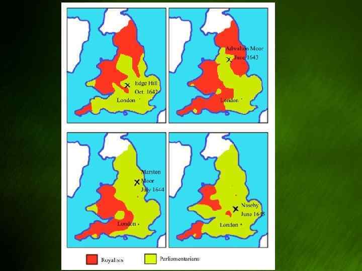 Первая гражданская война (1642 – 1646 гг. ) • Август 1642 г. – Карл объявил войну парламенту. Северные графства поддержали короля). • Парламент организовал Комитет обороны и принял постановление о наборе 10 – тысячной армии под командованием графа Эссекса. • 23 октября 1642 г. – военные неудачи парламентской армии при Эджхилле.