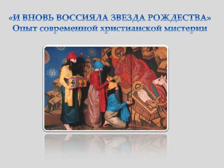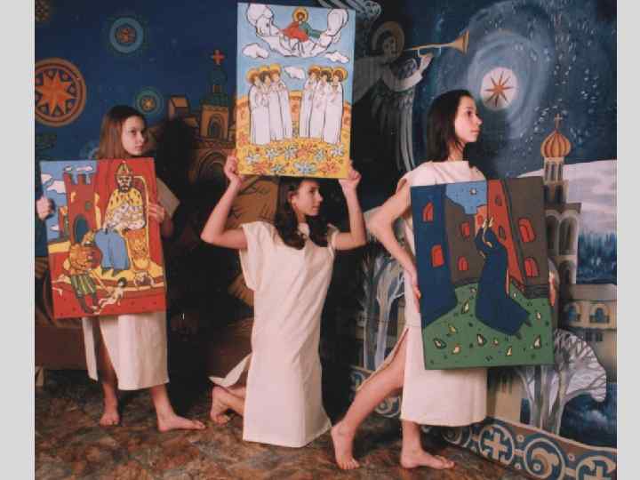 Этот проект является синтезом следующих выразительных составляющих: üТексты Ветхого и Нового Завета. üСтихи религиозного содержания русских поэтов 19 и 20 вв. üОтрывки из книги И. Шмелева «Лето Господне» . üДуховные стихи в исполнении ансамбля народной духовной музыки «Светилен» . üПластические миниатюры в исполнении артистов балета. üРепродукции с русских православных икон, проецируемые на экран. üРепродукции с дореволюционных и современных рождественских открыток. üАудиозаписи колокольных звонов. üДекорации, костюмы и реквизит. üКомплект звуковоспроизводящей, проекционной и осветительной аппаратуры.