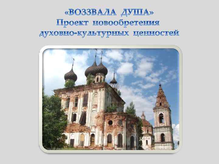 Акции из этого проекта были проведены у ждущих своего возрождения храмовых комплексов в селах Нижний Ландех и Холуй Ивановской области. На проведение акций было получено благословение Его Святейшества архиепископа Иваново. Вознесенского и Кинешемского Амвросия. Акции нашли поддержку Иваново. Вознесенского епархиального управления и администраций Пестяковского и Южского муниципальных районов. Акции состояли из трех частей: • Рассказ об истории создания храмовых комплексов и их историко-культурной ценности. • Молитва священника в поруганном и временно обустроенном для совершения молитвы храме. • Исполнение в храме цикла духовных песнопений четырежды лауреатом международных конкурсов хоровой музыки ансамблем народной духовной музыки «Светилен» .