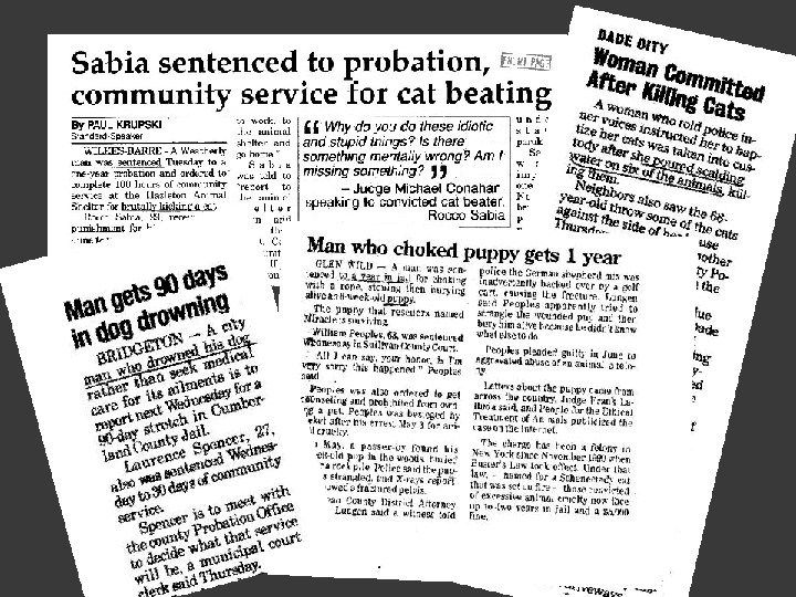 Crimes against animals as a felony offense • 1985: only 4 states prosecuted cruelty as a felony • 2014: South Dakota last of the 50 states to adopt felony penalties ( for some crimes) • cies
