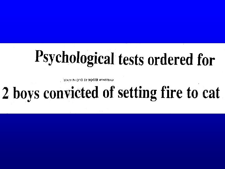 The Mc. Donald Triad: Fact or Urban Legend? J. M. Mc. Donald “The Threat to Kill” (AJP 1963) • Cruelty to animals, obsession with fire setting and persistent bedwetting linked to violent behaviors (homicidal and sexually predatory) • Actually linked to parental neglect, brutality and abuse.