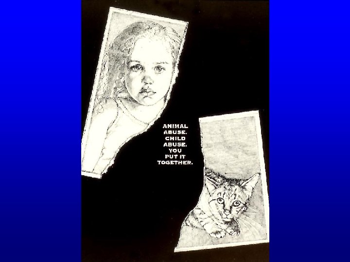 Incidence of Animal Abuse in 53 Child-Abusing Families • Animal abuse was reported in 88% of homes referred for physical abuse of children, compared with 34% of homes referred for neglect or childrenat-risk • Animal abuse perpetrated by fathers (2/3) and children (1/3) • Abusive households had more pets under 2 years of age and fewer over 2 De. Viney, Dickert and Lockwood (1983) The care of pets in child-abusing families. International Journal for the Study of Animal Problems