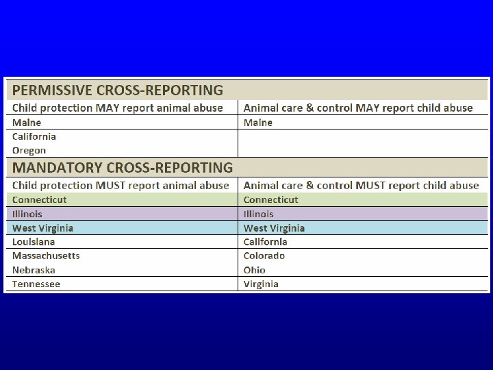 Legislation • New York: A-706 would include animal cruelty in the presence of a child as an element in endangering a child’s welfare, and within the definition of a neglected or maltreated child. • Oregon Law: increases the punishment for animal neglect in the first degree to a maximum of 5 years imprisonment and/or a $125, 000 fine for repeat offenders, offenses involving 10 or more animals, or neglect that occurs in the presence of a minor child.