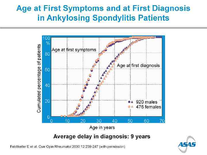 Prevalence of Axial Sp. A in US (NHANES study) chronic back pain in 20% of population IBP in 7% of population; > in younger adults Ax. Sp. A (including AS) in 1. 4% AS in 0. 5% AS nr. Ax. Sp. A MALES=FEMALES (Ax. Sp. A); M: F=2: 1 (AS) 12% in 2 years