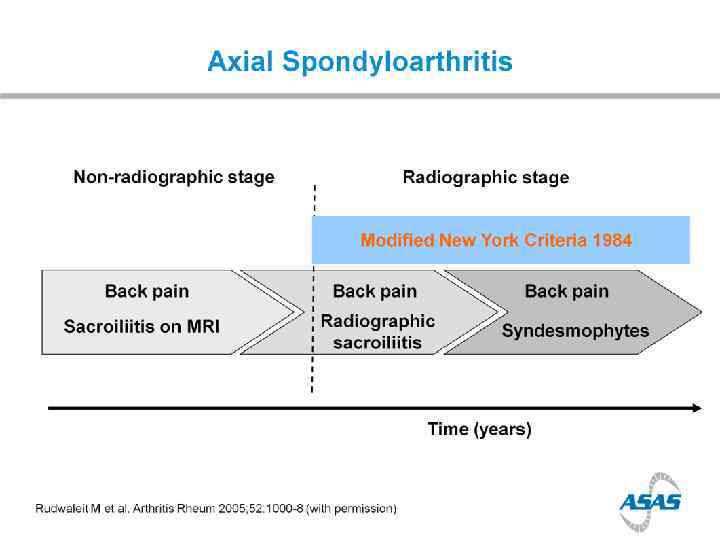 Q 5 Non-radiographic axial spondyloarthritis is An early phase of ankylosing spondylitis. 1 A variant of osteitis condensanse ilii. 2 A new name for DISH. 3 A variant of reactive arthritis. 4
