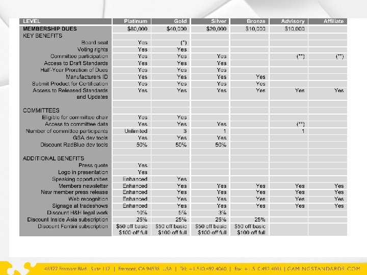 ORGANIZATION § Reorganized GSA § Streamlined policies § Enhanced membership value § Providing members with R&D and operations advantage over competitors § Providing members more control as they are directly invested § Exclusive for members § Standards § Certification § Manufacturer ID code § Reassessment of membership benefits § Introduction of Bronze membership level