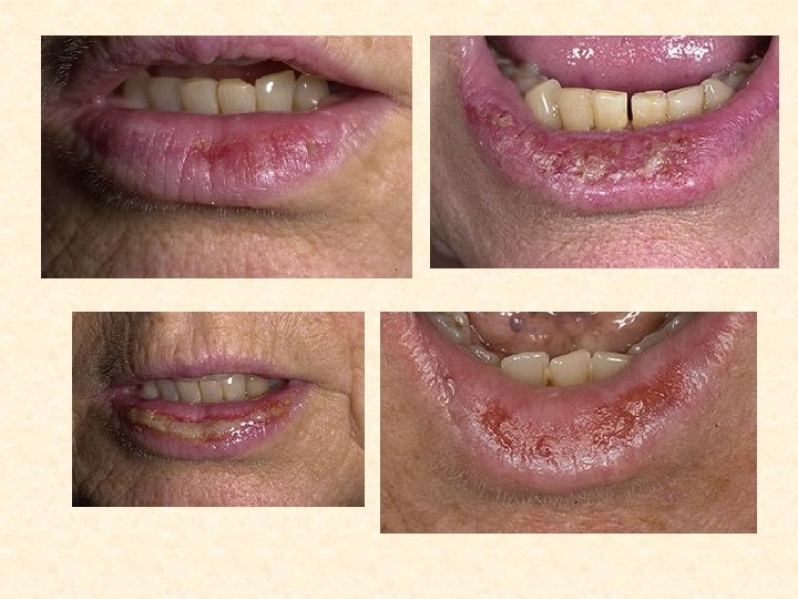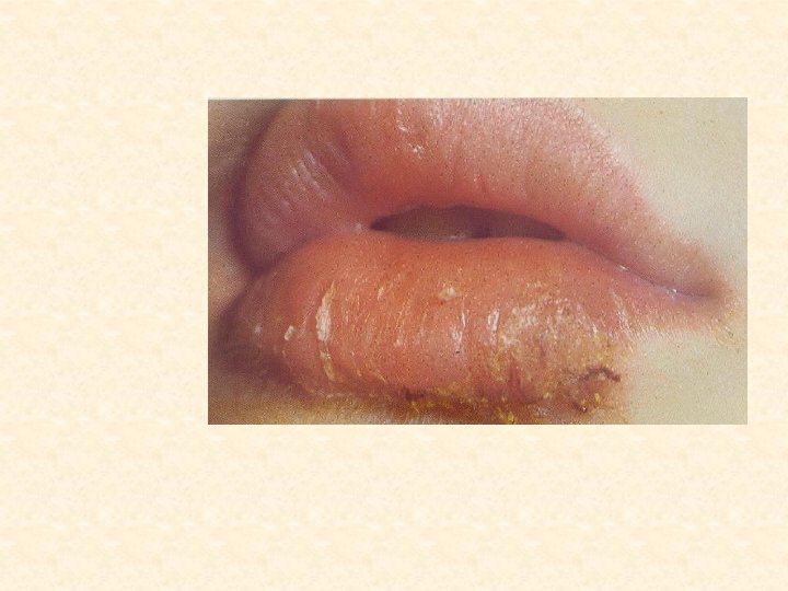 Атопический хейлит • Клиника • Начинается с зуда и появления розовой эритемы с четкими границами • Иногда отечность кожи и красной каймы губ • На месте расчесов появляются корочки • Острые воспалительные явления держатся недолго • Кр. кайма губ шелушится мелкими чешуйками и вся ее поверхность принизана тонкими радиальными полосками • Протекает длительно • Обострения в осенне-зимний период, летом ремиссия