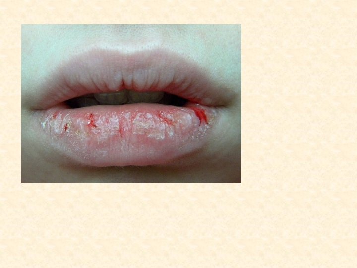 Атопический хейлит • Один из симптомов атопического дерматита или диффузного нейродермита • Известен еще под названиями: экзематозный, микробный, себорейный хейлит • Чаще встречается в возрасте 7 -17 лет • Большая роль отводится генетическим факторам –предрасположенность к атопической аллергии • Аллергенами могут быть пищевые продукты, медикоменты, цветочная пыльца, бытовая пыль, косметические средства • Поражается красная кайма губ и непременно кожа в области углов рта