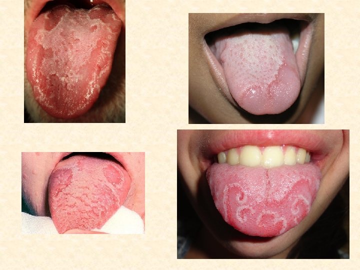 Десквамативный глоссит • Этиология и патогенез окончательно не выяснены • Считают, что это симптом различных заболеваний: ЖКТ, нейродистрафических процессов, заб-й кроветворной и эндокринной системы, нарушение витаминного баланса, аллергических состояний, аутоинтоксикаций • Встречается преимущественно у лиц женского пола в детском возрасте