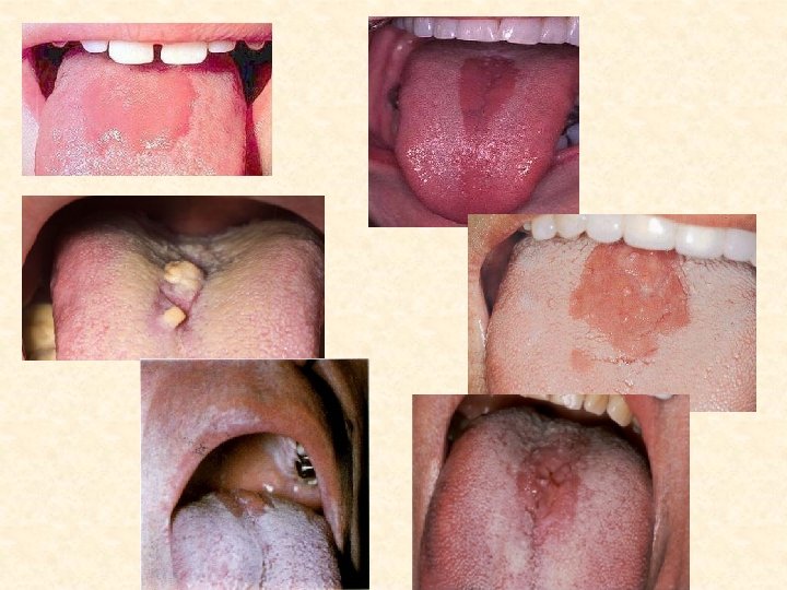 Ромбовидный глоссит • Хронический воспалительный процесс слизистой языка, лишенной сосочков • Заб- следует рассматривать как врожденное, обусловленное нарушением эмбриогенеза. • Провоцирующие факторы • -курение • -грибковая флора • -заболевания ЖКТ • -гиповитаминоз С • По средней линии языка впереди желобоватых сосочков обнаруживается единичный очаг ромбовидной или овальной формы шириной 0, 5 - 2 см, длиной 1, 5 -5 см.