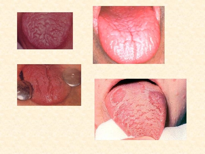 Десквамативный глоссит • Клинически различают несколько форм (А. И. Рыбаков, Г. В. Банченко, 1978) • 1. Поверхностная форма. Появление четко ограниченных ярко-красных пятен и полос, окруженных слизистой нормальной окраски. При слущивании эпителия –язык гладкий, блестящий. Субъективно- зуд и жжение. • 2. Гиперпластическая форма. Очаговое уплотнение и гипертрофия нитевидных сосочков – желтого и серого цвета • 3. Лихеноидная форма. Участки десквамации эпителия разных очертаний и величины, на которых увеличены грибовидные сосочки. Субъективно -жжение