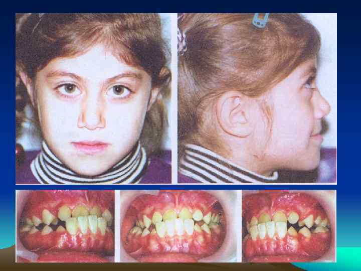 Лицевые признаки бывают выражены в виде укорочения нижней части лица, углубления супраментальной борозды, утолщения нижней губы и сопутствующих нарушений, характерных для дистального или мезиального прикуса.