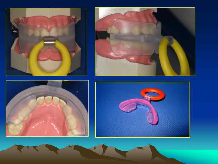• Эластопозиционеры, трейнер «I-3 TM» для коррекции аномалий III класса. • Аппарат Брюкля и шапочка с подбородочной пращой.