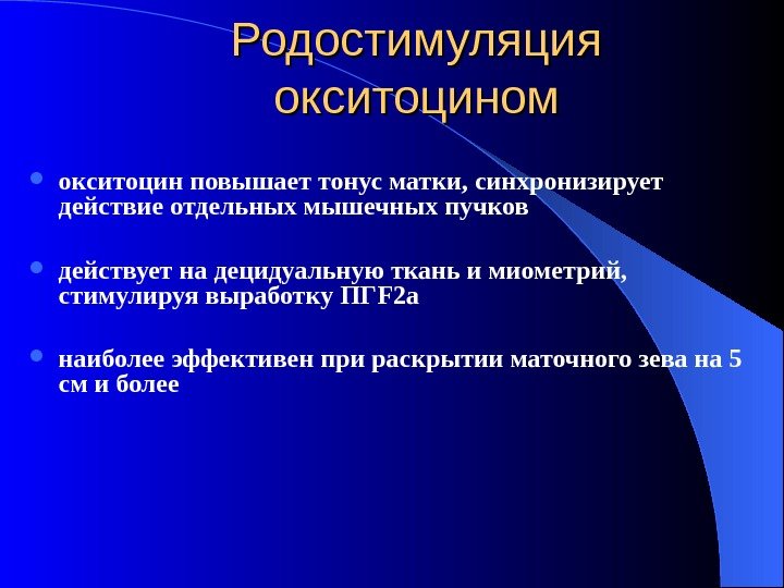 Родостимуляция окситоцином окситоцин повышает тонус матки, синхронизирует действие отдельных мышечных пучков действует на децидуальную ткань и миометрий, стимулируя выработку ПГ F 2 а наиболее эффективен при раскрытии маточного зева на 5 см и более