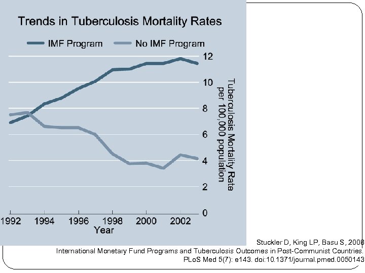 Stuckler D, King LP, Basu S, 2008 International Monetary Fund Programs and Tuberculosis Outcomes in Post-Communist Countries. PLo. S Med 5(7): e 143. doi: 10. 1371/journal. pmed. 0050143