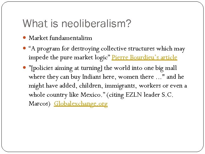 What is neoliberalism? Market fundamentalism “A program for destroying collective structures which may impede the pure market logic” Pierre Bourdieu’s article ”[policies aiming at turning] the world into one big mall where they can buy Indians here, women there. . . " and he might have added, children, immigrants, workers or even a whole country like Mexico. ” (citing EZLN leader S. C. Marcos) Globalexchange. org
