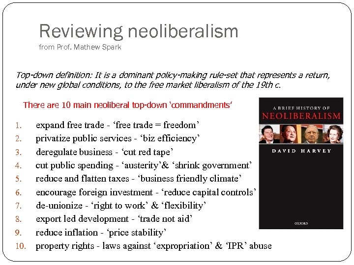 Reviewing neoliberalism from Prof. Mathew Spark Top-down definition: It is a dominant policy-making rule-set that represents a return, under new global conditions, to the free market liberalism of the 19 th c. There are 10 main neoliberal top-down ‘commandments’ 1. 2. 3. 4. 5. 6. 7. 8. 9. 10. expand free trade - ‘free trade = freedom’ privatize public services - ‘biz efficiency’ deregulate business - ‘cut red tape’ cut public spending - ‘austerity’& ‘shrink government’ reduce and flatten taxes - ‘business friendly climate’ encourage foreign investment - ‘reduce capital controls’ de-unionize - ‘right to work’ & ‘flexibility’ export led development - ‘trade not aid’ reduce inflation - ‘price stability’ property rights - laws against ‘expropriation’ & ‘IPR’ abuse