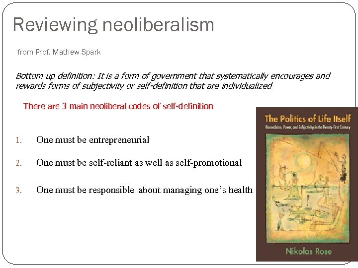 Reviewing neoliberalism from Prof. Mathew Spark Bottom up definition: It is a form of government that systematically encourages and rewards forms of subjectivity or self-definition that are individualized There are 3 main neoliberal codes of self-definition 1. One must be entrepreneurial 2. One must be self-reliant as well as self-promotional 3. One must be responsible about managing one’s health