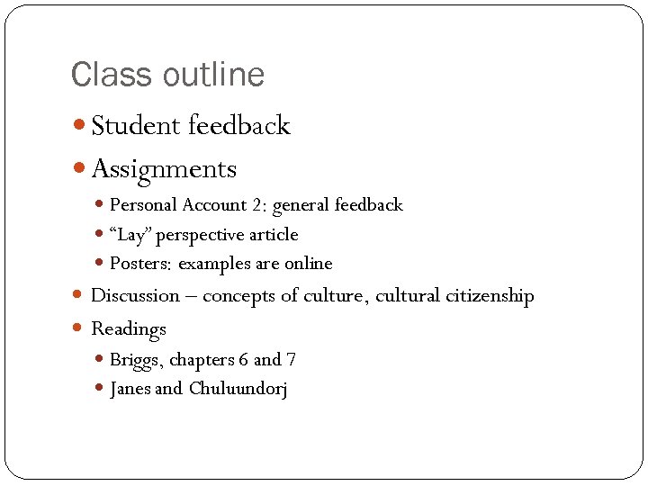 Class outline Student feedback Assignments Personal Account 2: general feedback “Lay” perspective article Posters: examples are online Discussion – concepts of culture, cultural citizenship Readings Briggs, chapters 6 and 7 Janes and Chuluundorj